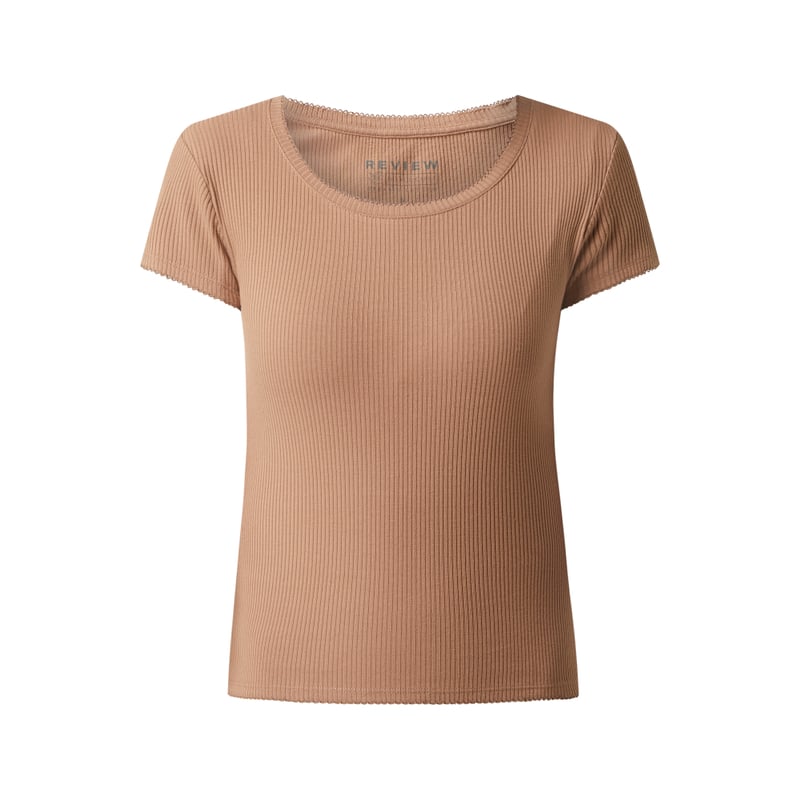 T-shirt damski REVIEW , Mieszanka bawełny ekologicznej z dodatkiem streczu , Taliowany krój , Prążkowana faktura , Okrągły dekolt , Ozdobne tasiemki, Długość tyłu w rozmiarze S: 47,5 cm