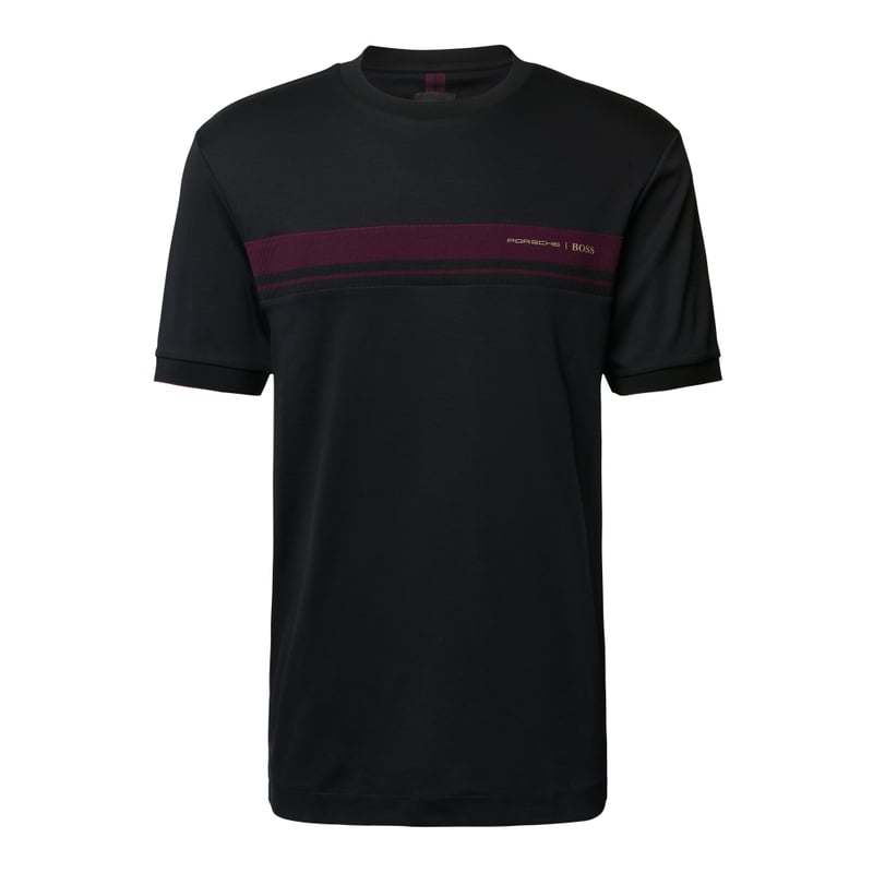T-shirt męski Porsche x BOSS, Czysta bawełna, Prosty krój, Model ‘Tiburt’, Paski w kontrastowym kolorze z napisem z logo, Okrągły dekolt, Zakończenia rękawów z prążkowanego ściągacza, Długość tyłu w rozmiarze M: 76 cm