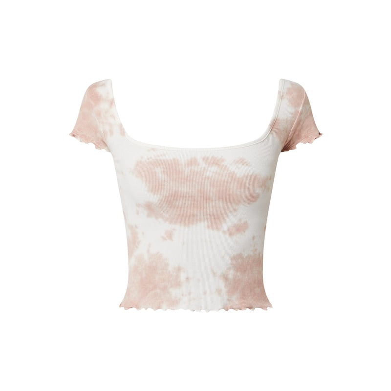 T-shirt damski REVIEW, Bawełna ekologiczna i elastan, Wąski krój , Prążkowana faktura , Wzór na całej powierzchni , Prostokątny dekolt , Falbaniaste wykończenie , Długość tyłu w rozmiarze S: 48 cm