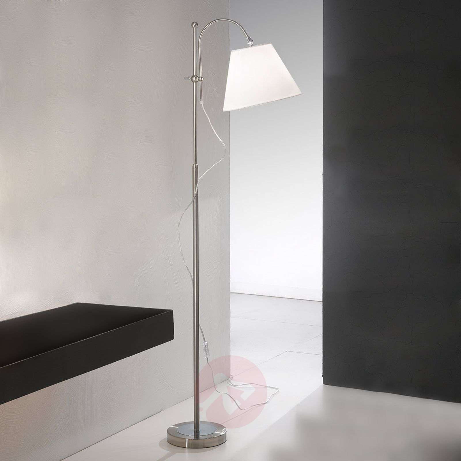 Klasyczna lampa stojąca LILLY z białym abażurem z materiału i wyginanym ramieniem Lampy z serii LILLY zachwycają klasyczną elegancją oraz precyzyjnym wykonaniem z wysokiej jakości materiałów. Oprawa w niklowym kolorze doskonale współgra z abażurem z ogniotrwałego, białego materiału. Ta lampa stojąca jest wyposażona we włącznik/wyłącznik oraz funkcję regulacji wysokości. Klasa efektywności energetycznej: A++