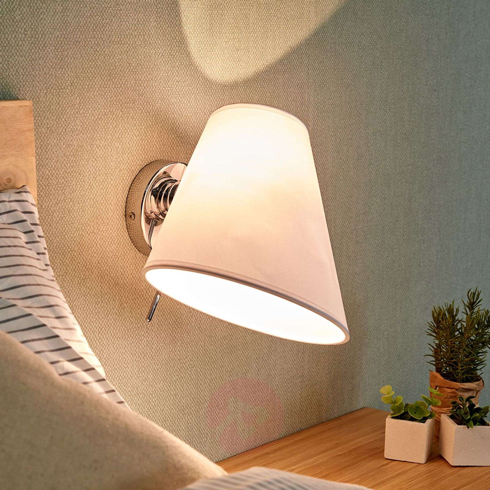 Gwendolin – lampa ścienna z tkaniny z odchylanym kloszem o interesującym kształcie i białej powierzchni Gwendolin to lampa ścienna, która dobrze komponuje się z nowocześnie urządzonymi pomieszczeniami mieszkalnymi i równie dobrze pasuje do salonu, jak i do sypialni czy pokoju gościnnego. Jej klosz ma niezwykły kształt, który charakteryzuje się przede wszystkim tym, że zwęża się ku górze. Powierzchnia tkaniny utrzymywana ma barwę ponadczasowej bieli, co zapewnia piękny efekt świetlny, gdy tylko lampa zostanie włączona. Dzięki obecności smukłego pręcika lampę można wygodnie obracać. Tym samym światło może być precyzyjniej ustawione i wykorzystywane do czytania. Mały przełącznik dźwigniowy na spodzie podstawy umożliwia włączanie i wyłączanie źródła światła bezpośrednio na miejscu, dzięki czemu lampa ta może być używana jako lampka nocna i umieszczona obok łóżka. Klasa efektywności energetycznej: A++