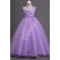 Fioletowa długa sukienka dla dziewczynki wykonana z tiulu, zdobiona kwiatkami 3D z kryształkami. Wieczorowa suknia dla dziewczynki.