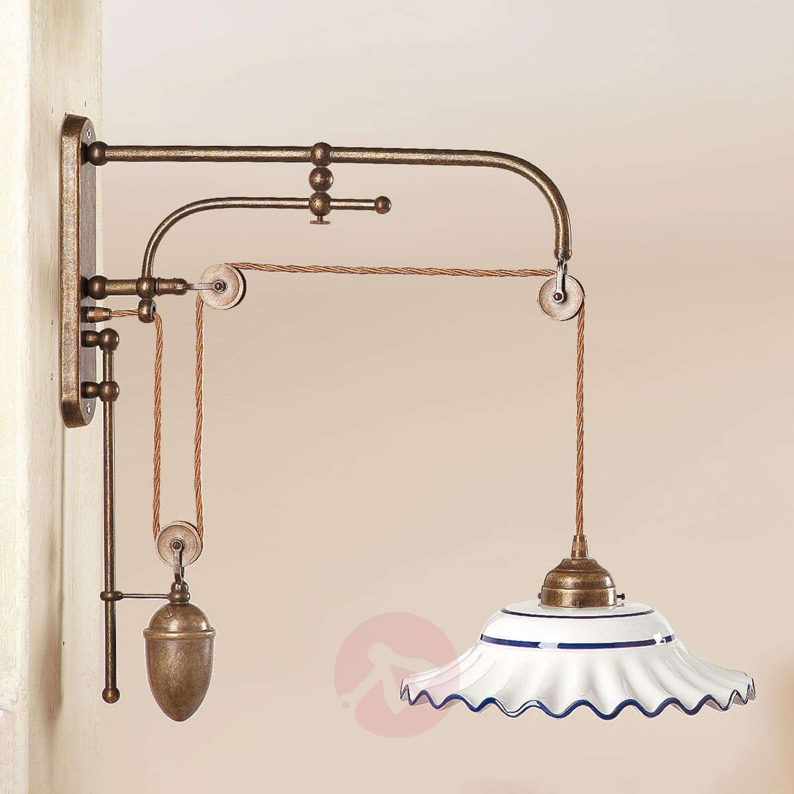 Z wbudowanym mechanizmem regulacji wysokości – ciekawa lampa ścienna Tiziano Tiziano charakteryzuje się przede wszystkim ciekawie zaprojektowaną regulacją wysokości. Lampa ścienna wyposażona jest w ciężarek, który mocowany jest do eleganckiego uchwytu ściennego. Biały, wygięty ceramiczny klosz został udekorowany niebieskim zdobieniem przypominającym listwę. Lampa ścienna Tiziano wygląda jak dzieło genialnego wynalazcy. Klasa efektywności energetycznej: A++
