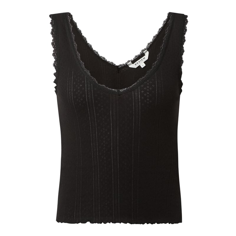Top damski REVIEW, Czysta bawełna, Dopasowany krój, Haft angielski, Dekolt w serek, Obszycie koronką, Faliste wykończenie, Długość tyłu w rozmiarze S: 52 cm