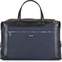 Torba podróżna na laptopa z kolekcji Office LeatherEkskluzywna torba podróżna wykonana z nylonu i skóry licowej o gładkiej strukturze. Model dostępny w głębokim odcieniu granatu z czarnymi akcentami ze skóry, dzięki którym zyskuje jeszcze więcej szykownego charakteru.Ogromnym atutem torby jest zorganizowane, pakowne wnętrze z dużymi kieszeniami. Wewnątrz: dwie kieszenie zamykane na suwak; pomieści format A4. Dodatkowo: z tyłu kieszeń zamykana na suwak; z przodu kieszeń zamykana na suwak; podstawa zabezpieczona metalowymi nóżkami; do torby dołączony jest odpinany, regulowany pasek.