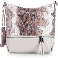 Torebka z kolekcji EleganceTo model torebkidla pewnych siebie kobiet, które docenią blask w połączeniu z pastelowymi odcieniami. Górna część torebki zefektem skóry wężowejzostała dodatkowo urozmaicona o mieniącą koloramipowierzchnię z połyskiem. Stylistykę dopełniają grafitowe okucia pasujące kolorystyczne do motywu na torebce.Nasza rada: przednia kieszeń, zapinana na dwubiegunowe zapięciejest niezwykle praktyczna. wykonana ze skóry licowej; zamykana na suwak; wewnątrz dwie kieszenie zamykane na suwak, otwarta kieszeń, otwarta kieszeń na drobiazgi oraz miejsce na telefon komórkowy; z przodu kieszeń zamykana na suwak; do torebki dołączony jest odpinany pasek oraz odpinany, regulowany pasek; dodatkowo pomieści format A4; zawieszka w formie chwostów.