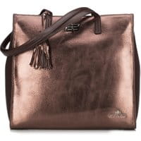 Torebka z chwostem z kolekcji EleganceKlasyczna torebka wykonana z pięknej skóry licowej o naturalnym połyskuto esencja ponadczasowej elegancji. Elementy w kolorze srebra oraz pukiel frędzli umocowany przy uchwycie zdobią prosty fason modelu, nadając całości wyjątkowy szyk. Nasi projektanci w bardzo przemyślany sposób rozplanowali wnętrze torebki, która ma specjalnie wygospodarowane miejsce na rozmaite akcesoria. W ofercie występują 2odcienie: klasyczna czerńoraz metaliczny brąz. komora główna zamykana na suwak, przedzielona kieszenią zamykaną na suwak; wewnątrz kieszeń zamykana na suwak, otwarta kieszeń na drobiazgi oraz miejsce na telefon komórkowy; pomieści format A4; z przodu kieszeń zabezpieczona metalowym zapięciem; z tyłu kieszeń zamykana na suwak; podstawa zabezpieczona metalowymi nóżkami.