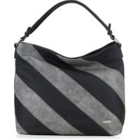 Torebka w paski z kolekcji YoungTorebka w kontrastowym duecie kolorystycznym, w ukośne pasy, wykonana z miękkiego poliuretanu o matowej, lekko chropowatej powierzchni. Srebrne detale są uzupełnieniem estetyki o casualowym charakterze. Luźny kształt i ukośny wzór na przedzie dodadzą stylizacji dynamiki.Nasza rada: fason typu hobo bag jest przeznaczony do noszenia na ramieniu. wykonana ze skóry ekologicznej; komora główna zamykana na suwak; pomieści format A4; wewnątrz kieszeń zamykana na suwak, otwarta kieszeń na drobiazgi oraz miejsce na telefon komórkowy; z tyłu kieszeń zamykana na suwak.