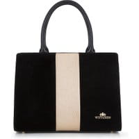 Skórzana torebka z kolekcji Elegance Torebkauatrakcyjniona szerokim, pionowym pasem biegnącym przez środek frontu.Modeluszyty z połączenia najwyższej jakości skóry naturalnych (groszkowanej skóry licowej oraz skóry zamszowej). Krótkie i zaokrąglone rączki oraz cienki, regulowany pasek dodają więcej funkcjonalności. Kuferek występuję w dwóch wersjach kolorystycznych: brązowo-beżowej oraz czarno-złotej.Nasza rada: lampasy są hitem tego sezonu! komora główna zamykana na suwak; wewnątrz otwarta kieszeń na drobiazgi, miejsce na telefon komórkowy oraz kieszeń zamykana na suwak; z tyłu kieszeń zamykana na suwak; do torebki dołączony jest odpinany, regulowany pasek; podstawa zabezpieczona metalowymi nóżkami.