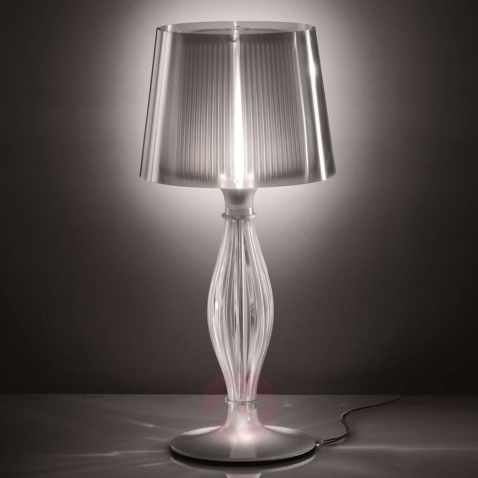 Smukła lampa stołowa Liza, przezroczysta Klasyczną metodą w przypadku lamp stołowych jest montowanie żarówki pod kloszem. Lampa stołowa Liza również podąża za tą tradycją, ale w jej dolnej części znajduje się również druga lampa LED. W ten sposób powstaje specjalny obraz stworzony ze światła, który stawia klasyczną lampę w nowym świetle w najprawdziwszym tego słowa znaczeniu i w ten sposób ukazuje pełnię jej piękna. Zastosowane materiały są nowoczesne i pochodzą z laboratorium pomysłów Slamp. Producent znany jest z zamiłowania do innowacyjnych pomysłów i posiada własny dział badań, w którym powstają innowacyjne materiały. Jeden z nich, Lentiflex®, został użyty w lampie stołowej Liza. Jest to poliwęglan, którego powierzchnia została poddana obróbce w celu utworzenia dwóch warstw o przeciwnym nachyleniu. Wynosi ono 0,15° i prowadzi do powstania efektu odbicia, jak to ma miejsce w przypadku wody. W zależności od kąta patrzenia i ilości padającego aktualnie światła zmienia się barwa światła i powstają liczne fasety. Lampa stołowa Liza już nawet w ciągu dnia, gdy jest wyłączona, zapewnia urzekające efekty kolorystyczne, a wieczorem po załączeniu staje się atrakcyjnym elementem przyciągającym wzrok, ponieważ zastosowana tu żarówka (o oprawce E27) powoduje powstanie gry barw, pełnej iskrzenia i blasku. Jej powierzchnia wygląda tak, jakby składała się z niezliczonych pryzmatów. Odbijają one wpadające do nich światło. Powstała w ten sposób gra kolorów jest doskonale widoczna, ponieważ pomimo refleksów świetlnych efekt oślepienia jest zredukowany do minimum. Jest to szczególnie ważne w przypadku lamp stołowych, gdyż umożliwia wygodną pracę. Światło o barwie ciepłej bieli (2 700 K) wyczarowuje grę światła i cienia w polu o wysokości 70 centymetrów i średnicy 35 centymetrów. Klasa efektywności energetycznej: A++