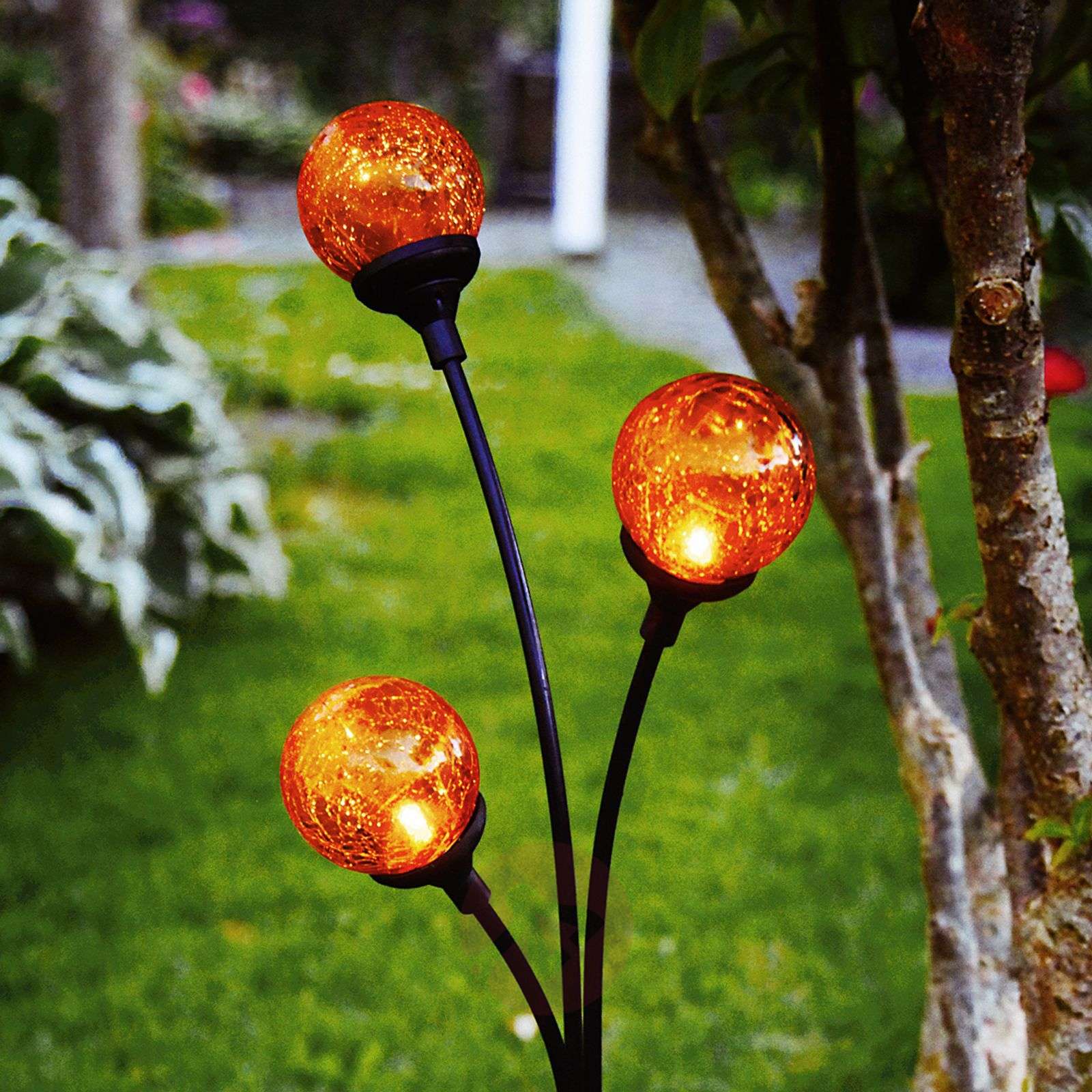 Trieste - lampa wbijana w ziemię LED z zasilaniem solarnym i trzema szklanymi kulami Trzy kule z pomarańczowego szkła podświetlane są przez bursztynowe źródła LED i wraz z nastaniem ciemności przyjemnie ozdobią ogród swoim ciepłym blaskiem. Dzięki panelowi słonecznemu na stojaku oraz akumulatorowi lampy świecą zasilane wyłącznie energią ze słońca. Czy to dookoła tarasu, czy też w szeregu na rabatkach - lampa wbijana w ziemię Trieste załączy się automatycznie wraz z nastaniem ciemności i będzie świecić przez maksymalnie 8 godzin;