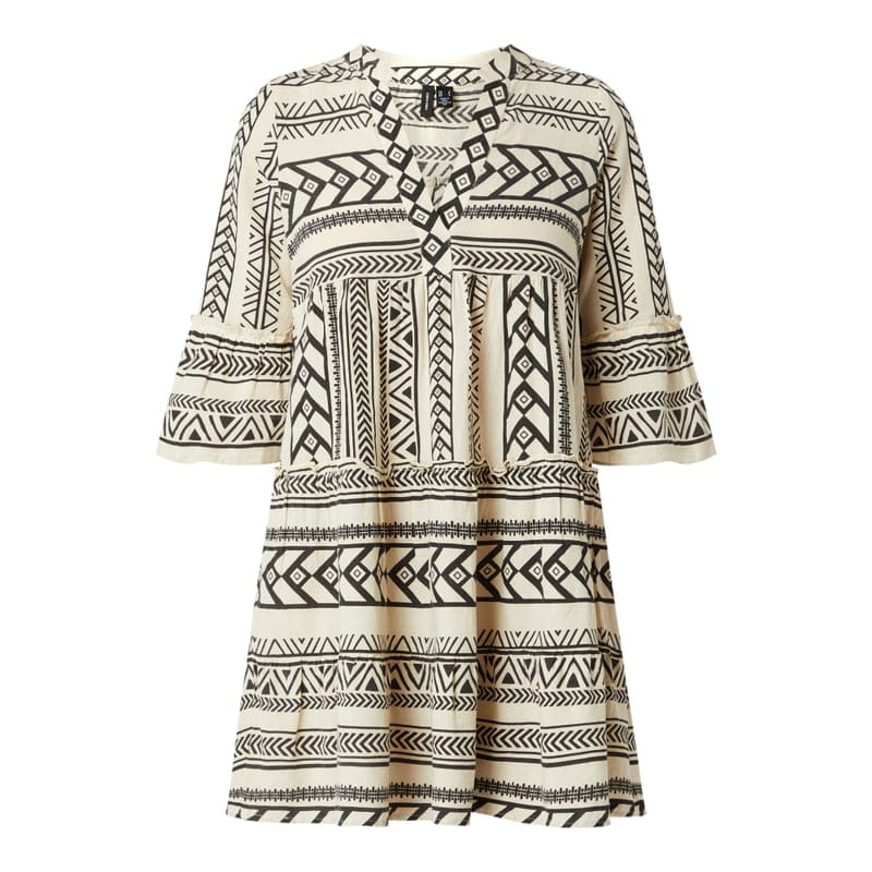 Tunika damska VERO MODA, Czysta bawełna ekologiczna, Lekko rozkloszowany krój, Styl etno, Kołnierz z lamówką, Rozszerzane rękawy o długości 3/4, Długość tyłu w rozmiarze S: 85 cm