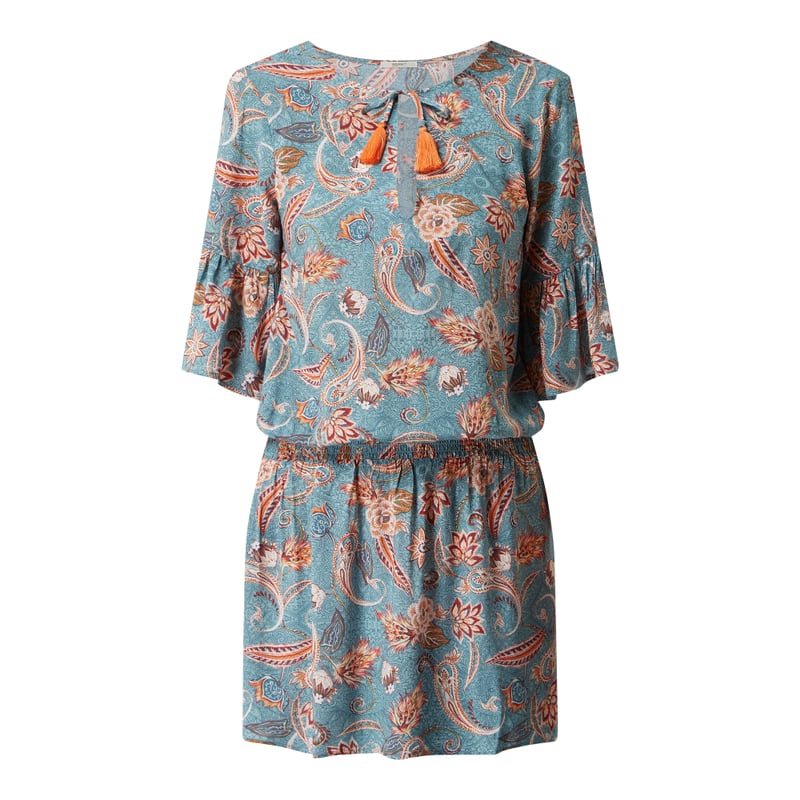 Tunika damska Esprit , Czysta wiskoza (LENZING™ ECOVERO™), Taliowany krój, Wzór na całej powierzchni, Wycięcie w kształcie łezki z ozdobnymi chwostami, Rękawy o dł. 1/2 z falbanami , Elastyczna wstawka w talii, Rozkloszowana spódnica , Długość tyłu w rozmiarze S: 93 cm