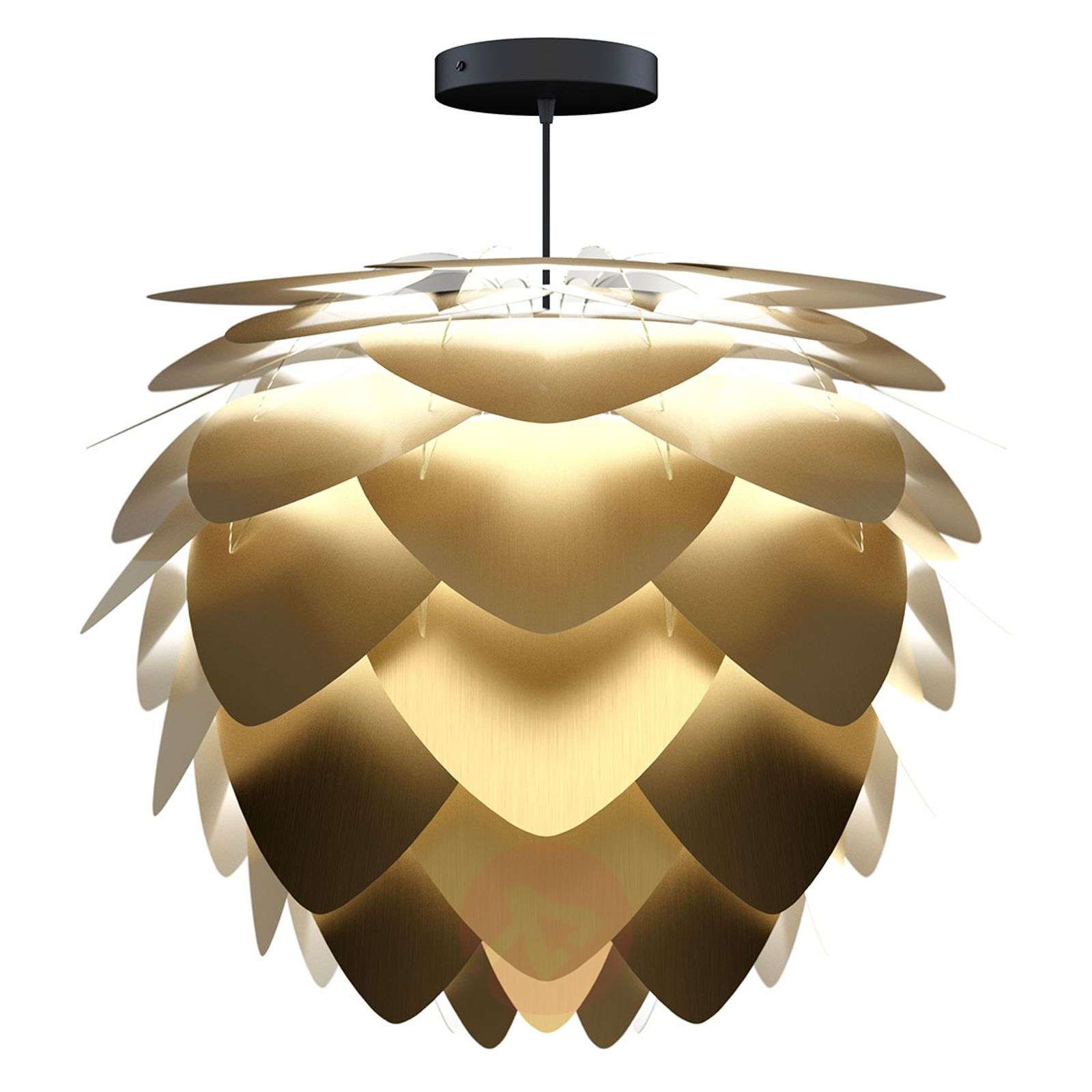 Inspirująca designerska lampa wisząca Aluvia medium z wykończeniem ze szczotkowanego mosiądzu Tworząc Aluvia medium, kuźnia designerska duńskiego producenta UMAGE stworzyła zarazem atrakcyjny przedmiot, który przyciąga wzrok. Ta lampa wisząca przypomina gigantyczny kwiat egzotycznej rośliny. Nakładające się na siebie liście wykonane z aluminium rozbłyskują barwą szczotkowanego mosiądzu i emanują szlachetnym połyskiem. Światło jest emitowane w górę i w dół, a także odbija się w przestrzeniach między liśćmi. Aluvia służy jako źródło światła, na przykład nad stołem w salonie lub jadalni, a także stanowi element, który zawsze przyciągnie wzrok. Zawieszenie z rozetą sufitową, kablem i oprawą ma dyskretny czarny kolor. Klasa efektywności energetycznej: A++