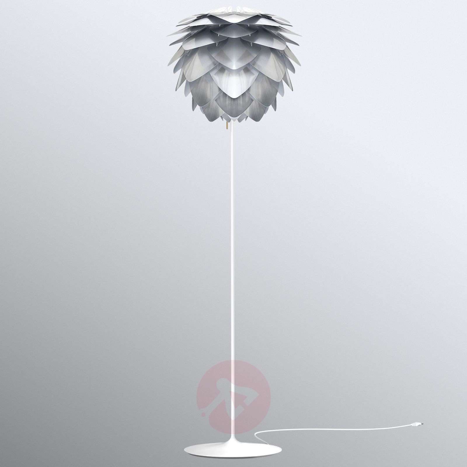 Designerska lampa stojąca Silvia medium o kloszu w kolorze stalowym Gdy przyjrzymy się lampie stojącej Silvia medium, na pierwszy plan wysuwa się jedna rzecz: naturalna struktura klosza składa się z dużej ilości elementów z tworzywa sztucznego, mających kształt liści. Trójkątny kształt poszczególnych elementów sprawia, że światło nie tylko przenika przez otwory u góry i u dołu klosza, ale także wydostaje się przez przestrzenie pomiędzy elementami wyglądającymi jak liście. W rezultacie powstaje fascynująca aranżacja świetlna, która sprawia, że miejsce do siedzenia w salonie staje się bardzo przytulne. Wyposażona w dekoracyjny mosiężny przełącznik. Podczas gdy stalowy klosz lampy został zaprojektowany przez zespół Vita Design Team, podstawa tej lampy Champagne ma barwę neutralnej bieli i została opracowana przez Andersa Klema, duńskiego projektanta, który odkrył swoją pasję do projektowania nowoczesnych lamp po ukończeniu Duńskiej Królewskiej Akademii Sztuk Pięknych/Szkoły Designu w 2013 roku. Głównym celem duńskiej firmy oświetleniowej UMAGE jest tworzenie produktów o nowoczesnym skandynawskim designie przy jednoczesnym zachowaniu zasad skandynawskiego piękna i wysokiej funkcjonalności poprzez staranne wykonanie. Klasa efektywności energetycznej: A++