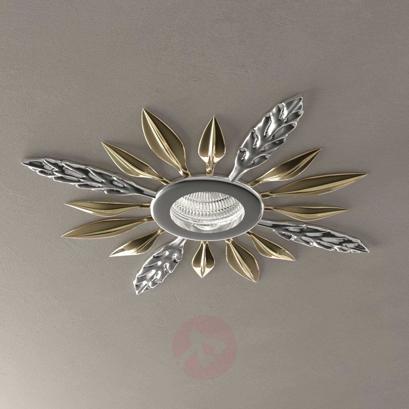 Wysokonapięciowa lampa wpuszczana FELLO z ozdobnymi metalowymi elementami Lampa wpuszczana FELLO urzeka z jednej strony ciekawym i efektywnym oświetleniem, a z drugiej strony metalowe elementy w kształcie liści na jej obwodzie prezentują się wyjątkowo dekoracyjnie. Wygląd. Lampa nadaje wnętrzom jednoznaczne akcenty i może oświetlać najróżniejsze pomieszczenia. Lampa FELLO jest dostępna w trzy kolorach: złotym, białym i chromowym. Klasa efektywności energetycznej: A++