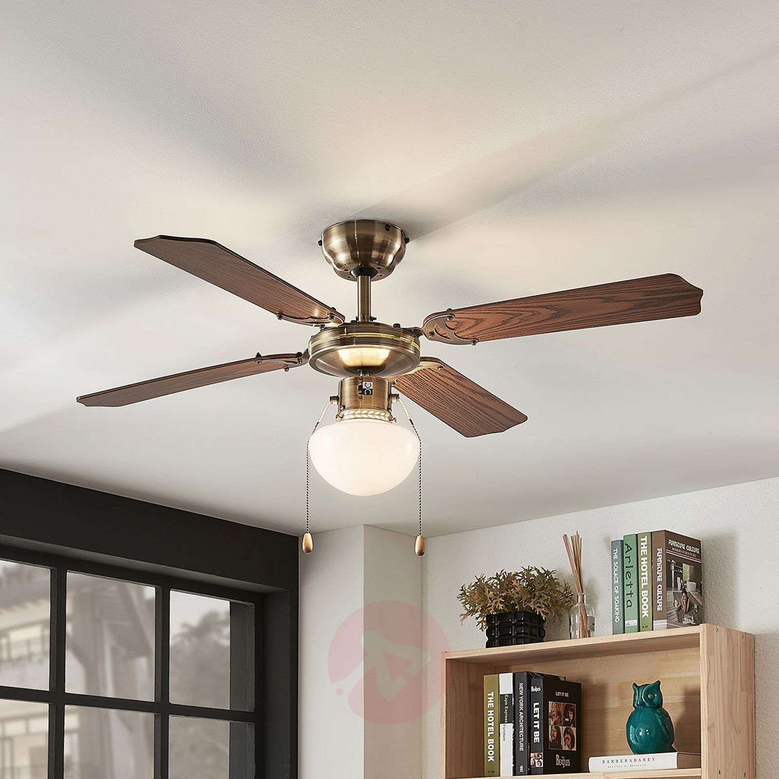 Czterołopatkowy wentylator sufitowy Joulin z oświetleniem, kolor drewna dębowego, tryb letni/zimowy Ten wentylator sufitowy łączy w sobie element zapewniający powiew świeżości i oświetlenie pomieszczenia mieszkalnego. Ponadto można zmieniać prędkość obrotów, a sam wentylator może obracać się w przód i wstecz. Joulin przekonuje wizualnie obecnością klasycznego designu, ma bowiem łopatki w kolorze drewna dębowego i elementy z plecionki oraz podstawę o barwie starego mosiądzu. Funkcje: Prędkość obrotową można zmieniać trójstopniowo, korzystając z przełącznika linkowego. Ten oświetlany wentylator sufitowy może pracować w trybie letnim. W zimie z kolei efektywnie rozprowadza w pomieszczeniu ciepłe powietrze. Do zmiany trybu pracy wentylatora służy przełącznik znajdujący się na obudowie. Źródło światła znajduje się w środku, pomiędzy czterema łopatkami. W oprawkę montuje się żarówkę E27. Okazuje się to być bardzo praktyczne, gdy użytkownik dysponuje tylko gniazdkiem elektrycznym znajdującym się na suficie, a nadal chce zapewniać w pomieszczeniu odpowiedni przepływ powietrza. Dane techniczne Moc na daną prędkość obrotową: - 47 waty przy 235 obr./min - 37 wat przy 185 obr./min - 33 wat przy 115 obr./min Maksymalny przepływ objętościowy (Q): 112,15 m³/min Pobór mocy wentylatora (P): 47,3 W Wartość użytkowa (SV): 2,38 (m³/min)/W (IEC60879:1986) Pobór mocy w trybie czuwania (PSB): 0,00 W Poziom emisji hałasu osiągany przez wentylator (LW): 52,2 dB (A) Maksymalna prędkość powietrza (c): 2,05 m/s Klasa efektywności energetycznej: A++