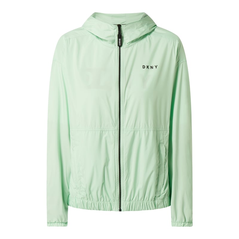 Wiatrówka damska DKNY PERFORMANCE, Wytrzymały materiał, Prosty krój, Kaptur, Obniżone ramiona , Długie rękawy z marszczeniem, Zamek błyskawiczny, Kieszenie z wypustkami, Logo, Elastyczne brzegi, Długość tyłu w rozmiarze S: 60 cm