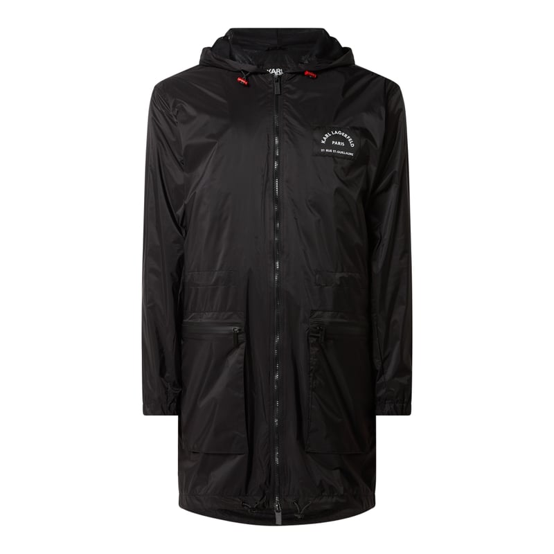Wiatrówka męska KARL LAGERFELD, Wytrzymały materiał , Luźny krój , Kaptur , Karczek , Zamek błyskawiczny , Kieszenie z patką , Nadruki z logo , Długość tyłu w rozmiarze 50: 96 cm, Szerokość ramion w rozmiarze 50: 51 cm, Długość rękawa w rozmiarze 50: 63 cm