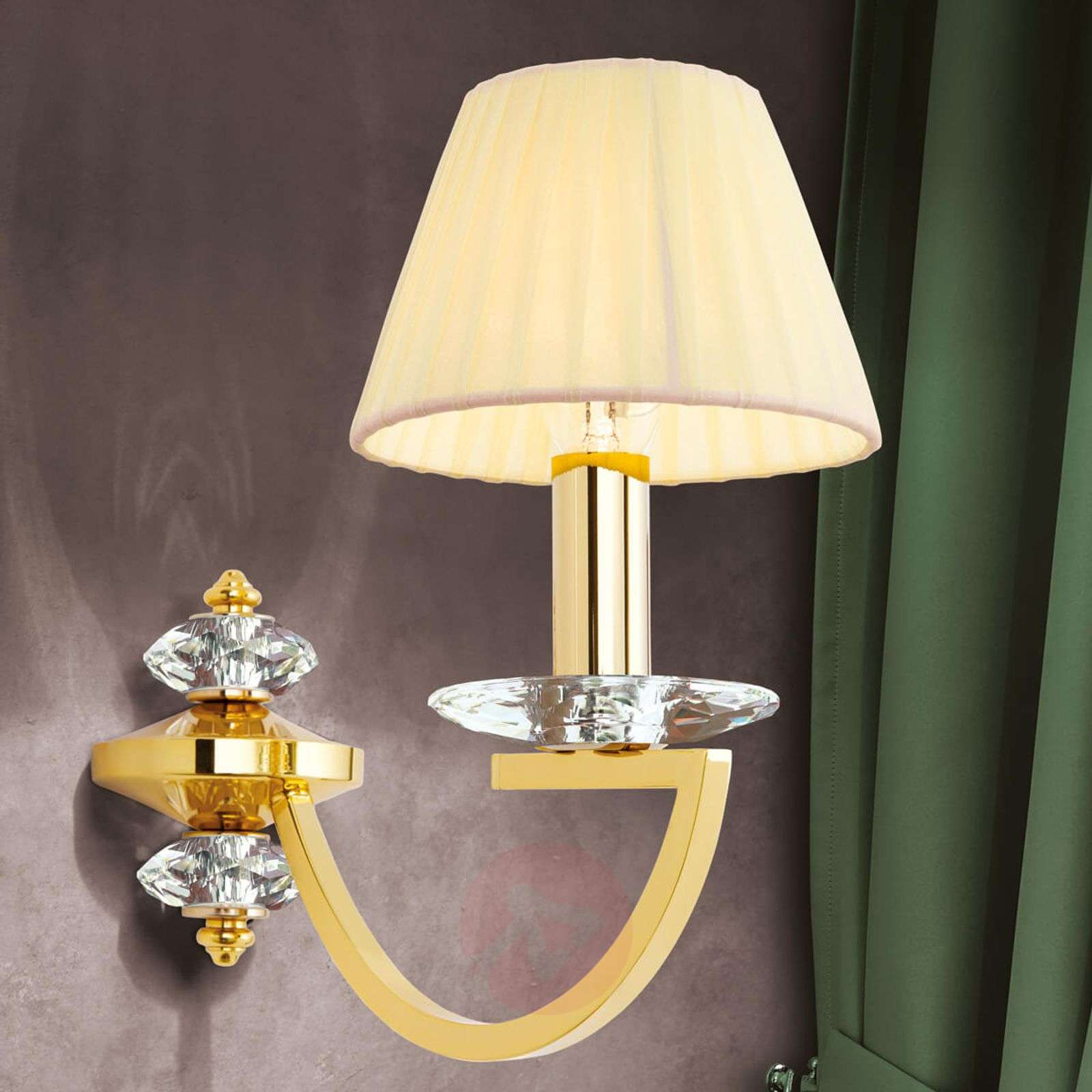 Avala – pozłacana lampa ścienna z eleganckim kloszem z organzy Klosz z organzy w kolorze szampana i błyszczący, złoty uchwyt ścienny, który został udoskonalony ekskluzywnymi kryształami górskimi marki Swarovski, zostały doskonale do siebie dopasowane w tej lampie ściennej Avala. Wysokiej jakości lity mosiądz posłużył w tej lampie jako podstawowy materiał do wykonania mocowania ściennego. Wreszcie 24-karatowe złocenie sprawia, że Avala staje się lampą, która promienieje blaskiem i luksusem. Kontrast w stosunku do błyszczącego metalu i błyszczących kryształów stanowi plisowany klosz z organzy, który stanowi prosty komponent tej lampy. Do dziś producent tej lampy ściennej wytwarza swoje wyroby w austriackim zakładzie produkcyjnym. Jakość lamp jest więc na bardzo wysokim poziomie, a dostępność części zamiennych gwarantowana jest również przez wiele lat. Klasa efektywności energetycznej: A++