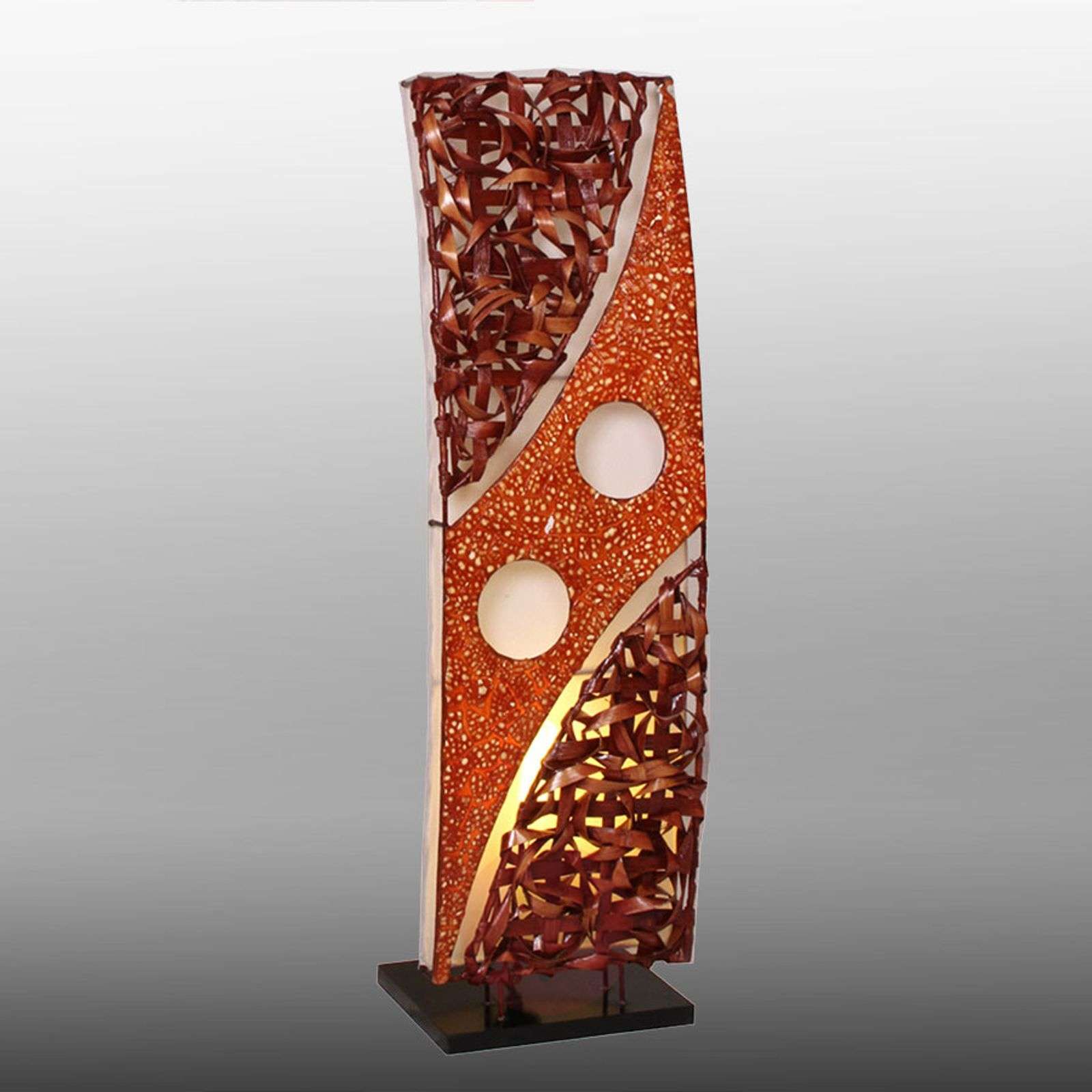 Dekoracyjna lampa stojąca MONA z naturalnych materiałów, wysokość 70 cm Dekoracyjna, ręcznie wykonana lampa stojąca MONA. Do jej wykonania użyto naturalnych materiałów, takich jak liście drzewa bananowego, rattan i kokos. Zastosowanie prostokątnej, drewnianej podstawy zapewnia jej stabilność. Łagodne światło lampy sączy się przez piękny abażur i wypełnia pomieszczenie, a lampa zdobi je, niezależnie od tego czy jest włączona. Dostosowana do źródeł energooszczędnych; dostępna w rozmiarach - 70 i 90 cm wysokości. W zestawie z 2 m przewodem doprowadzającym i umieszczonym na nim przełącznikiem światła. Klasa efektywności energetycznej: A++