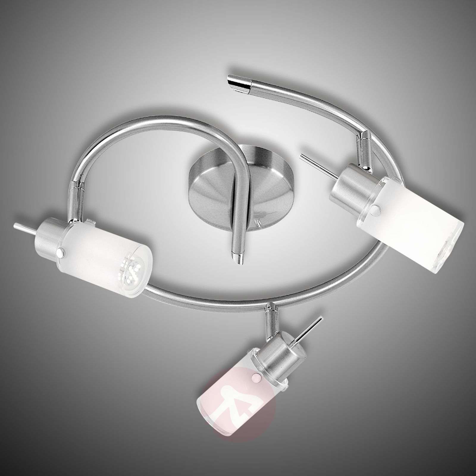 Trzypunktowa lampa sufitowa LED do ogólnego oświetlenia wnętrz Lampa sufitowa LED MAX charakteryzuje się nowoczesnym a zarazem ponadczasowym designem w kolorze stali, a do tego jest funkcjonalna dzięki trzem ruchomym reflektorom, które umożliwiają ustawienie światła w dowolnym kierunku. Satynowe szkło rozprasza je, tworząc łagodną poświatę, dzięki czemu ta charakteryzująca się wyginaną konstrukcją lampa stworzy nastrojową atmosferę w salonie, korytarzu a także w holu. Dostawa obejmuje żarówki (3 x 4 W LED GU10). - Barwa światła: ciepła biel - 3 000 kelwinów - 1 200 lumenów Klasa efektywności energetycznej: A+