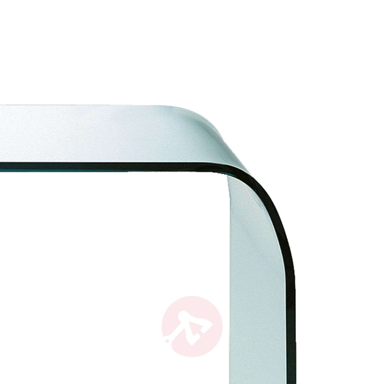 Efektowny stolik pomocniczy firmy Fontana Arte Ten stół jest wykonany z jednego kawałka szkła float o grubości 15 mm, dzięki czemu powstał taki wygięty kształt. Fantastycznym zjawiskiem towarzyszącym jest to, że nie ma on rogów i może być stosowany jako odpowiedni dla dzieci. Przezroczysty i ponadczasowy wygląd umożliwia jego optymalne łączenie się z wieloma stylami wyposażenia wnętrz.