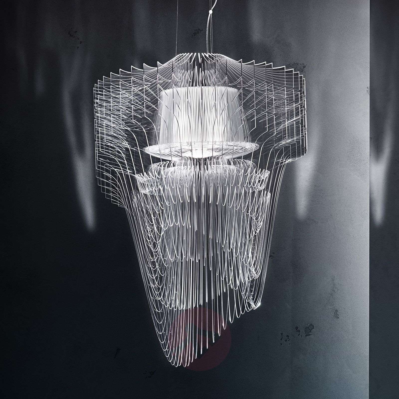Dynamiczna designerska lampa wisząca ARIA z LED Lampy marki Slamp odznaczają się nie tylko niezwykłym designem, ale również zastosowaniem wyjątkowych materiałów. Lampa wisząca ARIA jest wykonana z dwóch tworzyw sztucznych Cristalflex® i Lentiflex®, które pięknie rozpraszają emitowane z wnętrza lampy światło. Efekt ten dodatkowo potęgują liczne transparentne powierzchnie, przez które światło przenika na zewnątrz. Wizjonerskie lampy tworzone przez designerów we Włoszech - Slamp Włoska kuźnia designerów Slamp z siedzibą w Rzymie została założona na początku lat 90. XX wieku. przez Roberto Zilianiego. Ziliani już wcześniej działał twórczo zanim odkrył swoją pasję i możliwości, jaki daje światło. Spełniające najwyższe standardy materiały, wykonanie i jakość Marka Slamp kładzie szczególny nacisk na tworzenie nowych materiałów. Oprócz naturalnych i tradycyjnych surowców takich jak skóra, miedź, kryształ czy stal szlachetna firma Slamp wykorzystuje również własne opatentowane materiały jak Cristalflex®, Opalflex® i Lentiflex®. Dzięki nim możliwe jest stworzenie wyjątkowych efektów świetlnych. Na przykład materiał Lentiflex® służy jako woda, która w zależności od kąta patrzenia zmienia kolor. To właśnie własne materiały marki Slamp oraz powstałe z nich lampy są silnymi atutami firmy. Należą do nich również między innymi spory poziom innowacji, kreatywności oraz oryginalności, a także doskonałe wyczucie działania światła. Klasa efektywności energetycznej: A+