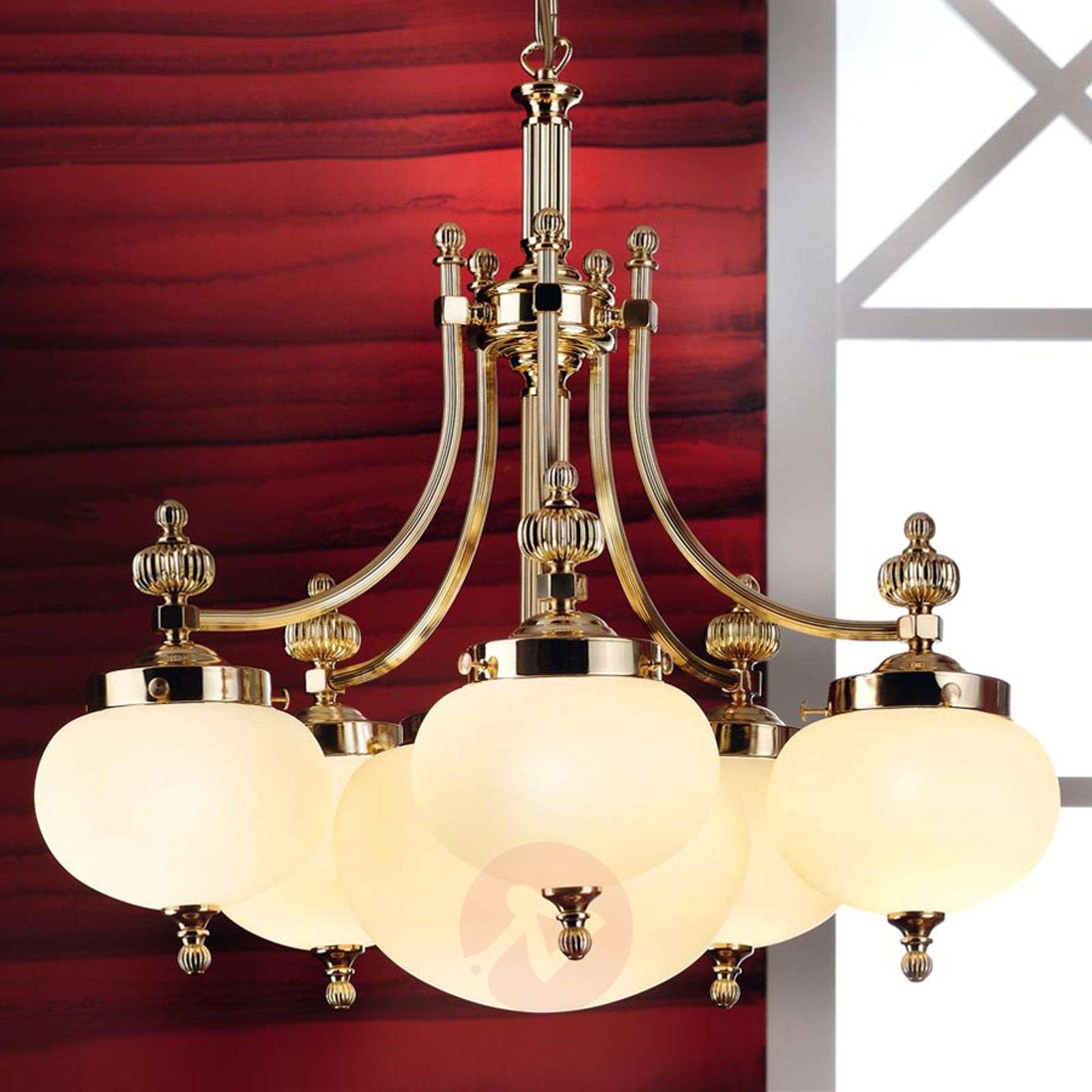 Imponująca lampa wisząca Ophelia w stylu klasycznym Klasyczna lampa wisząca Ophelia utrzymana jest w stylistyce wiedeńskich kawiarni. Korpus lampy wykonano z mosiądzu, a jego powierzchnię wypolerowano na błysk. Niemal kuliste klosze skrywają źródła światła, przy czym jeden z kloszów - umieszczony centralnie - jest większy od pozostałych i może zostać wyposażony w maks. 75 W E27 zamiast maks. 60 W E27, jak pozostałe pięć mniejszych. Ekskluzywne, utrzymane w matowym odcieniu koloru szampańskiego, trzywarstwowe klosze umożliwiają wyjątkowo jednorodne rozprowadzanie światła i chronią przed oślepieniem. Klosze opatrzone są ładnymi ornamentami z mosiężnego odlewu ciśnieniowego, które dodają tej lampie wiszącej pewnego klasycznego oraz antycznego uroku. Łańcuch można skrócić przy montażu. Lampa wisząca Ophelia to produkt wykonany ręcznie w Austrii. Starannie dobrane materiały oraz tradycyjna sztuka rzemieślnicza zapewniają długotrwałą i wysoką jakość. Klasa efektywności energetycznej: A++