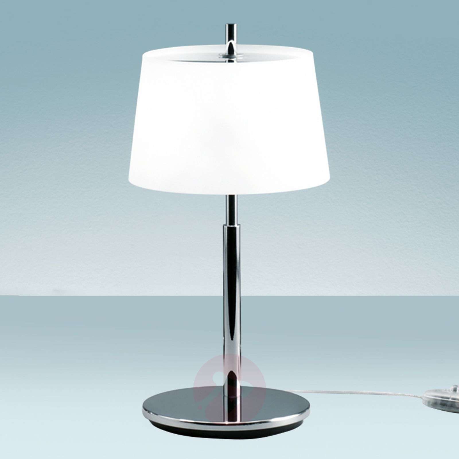 Imponująca lampa stołowa NOBI firmy Fontana Arte PASSION ma w pełni elegancki wygląd, posiada klosz o klasycznym kształcie z dmuchanego, satynowanego szkła i dzięki temu oświetla wnętrze stonowanym światłem. Natomiast nowoczesne akcenty w tej lampie stołowej tworzy jej podstawa z chromowanego mosiądzu i asymetrycznie umieszczony pręt. Wbudowany ściemniacz umożliwia ponadto ustawienie jasności, odpowiednio do indywidualnych potrzeb. Klasa efektywności energetycznej: A++