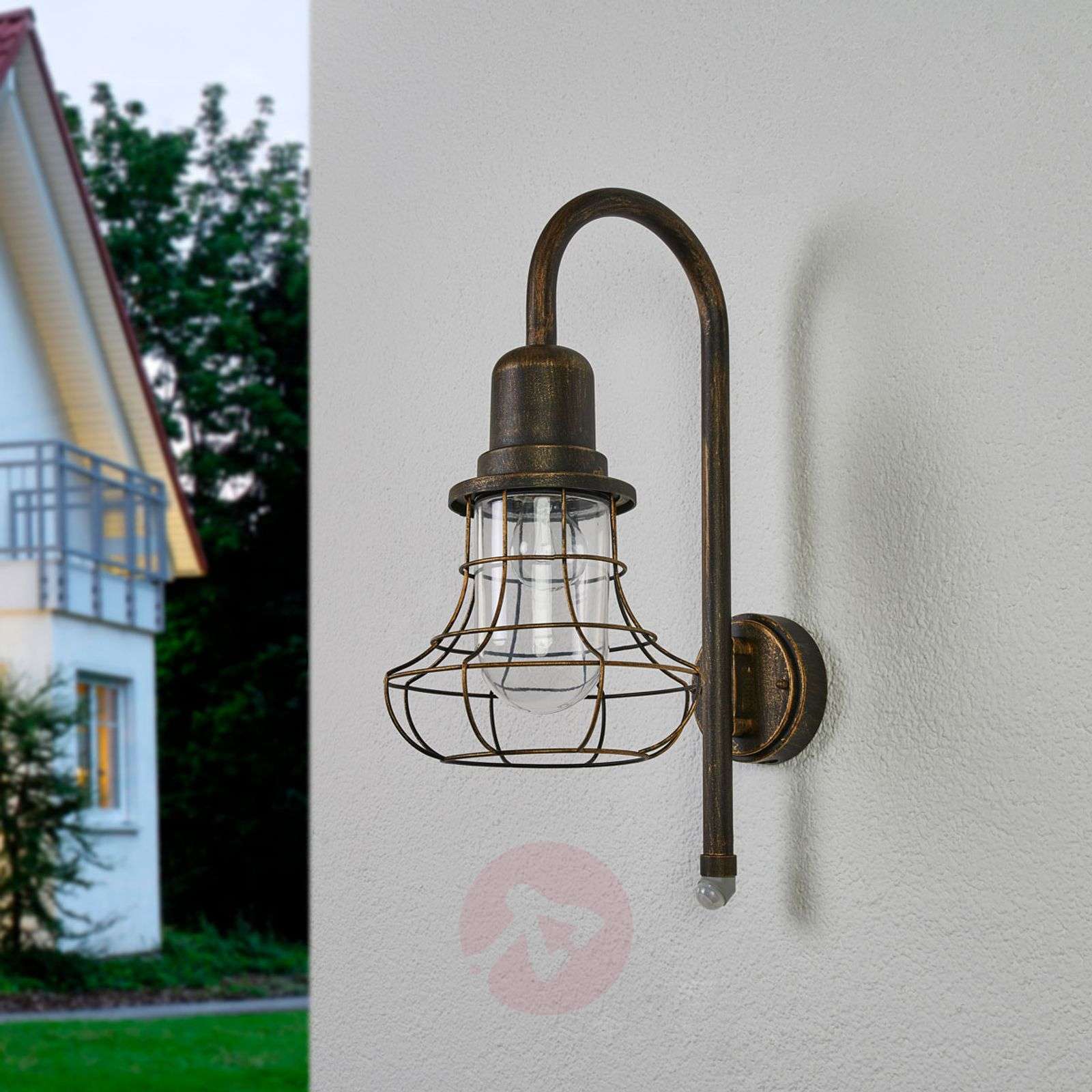 Antyczna lampa zewnętrzna ścienna Bird z czujnikiem Przypominający klatkę klosz, wygięte ramię i brązowo-złote wykończenie sprawiają, że lampa Bird wygląda jak klasyczna, niemal zabytkowa lampa, która nawet po wyłączeniu przyciąga wzrok. Dzięki przezroczystej szybie, która otacza źródło światła, lampa może swobodnie promieniować dookoła. W dolnej części ramienia przymocowany został czujnik ruchu. Dane techniczne czujnika ruchu: - możliwość ustawienia czasu świecenia od 10 sekund do 5 minut - kąt detekcji: 90 stopni - pole detekcji: 1-8 metrów - Czujnik światła regulowany 30 do 60 Lux Klasa efektywności energetycznej: A++