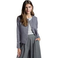 Wełniany żakiet damskiDamska marynarka wykonana z wełny o pudełkowym kroju. Fioletowy model uzupełniony o ciemny splot zapinany jest na cztery guziki. Klasyczny fason posiada półokrągły dekolt, który subtelnie eksponuje dekolt. Wełniany żakiet inspirowany stylem retro doskonale uzupełni wizerunek eleganckiej kobiety, która nawet na co dzień wybiera klasykę w modzie.Nasza rada: krótki żakiet doskonale podkreśli odcięcie w talii. wykonany z najlepszej jakości wełny; wykończony półokrągłym dekoltem; zapinany na guziki.