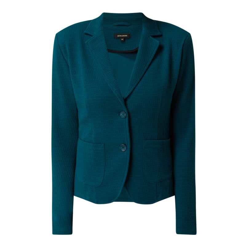 Żakiet damski MORE & MORE, Mieszanka materiałów z dodatkiem wiskozy i streczu , Taliowany krój , Tkana faktura , Kołnierz z połami, Listwa guzikowa z 2 guzikami , Nakładane kieszenie , Długość tyłu w rozmiarze 36: 53 cm , Szerokość ramion w rozmiarze 36: 41,5 cm , Długość rękawa w rozmiarze 36: 59 cm