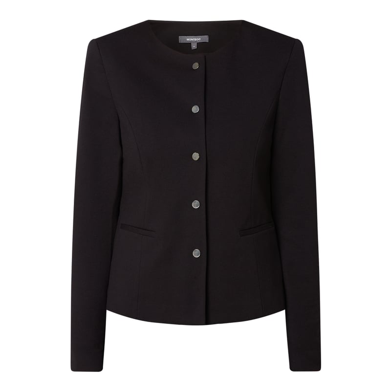 Żakiet damski MONTEGO , Mieszanka wiskozy z dodatkiem streczu , Wąski krój , Okrągły dekolt , Listwa guzikowa , Ozdobne wypustki, Lekka podszewka , Długość tyłu w rozmiarze 36: 52 cm, Szerokość ramion w rozmiarze 36: 38 cm, Długość rękawa w rozmiarze 36: 61 cm