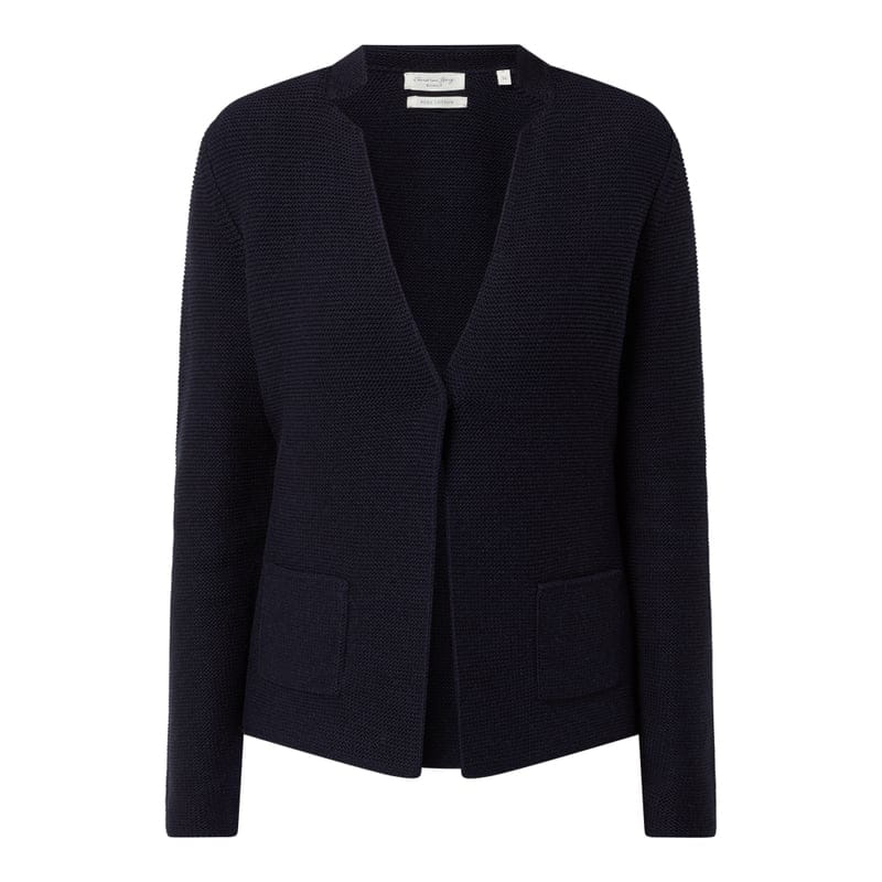 Żakiet z dzianiny damski Christian Berg Women, Czysta bawełna, Taliowany krój, Oczka z fakturą, Kołnierz z połami, Zapięcie na 1 guzik, Nakładane kieszenie, Długość tyłu w rozmiarze 36: 59 cm, Szerokość ramion w rozmiarze 36: 38 cm, Długość rękawa w rozmiarze 36: 65 cm