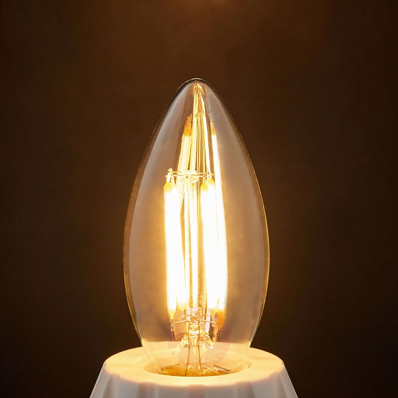 Przezroczysta żarówka świeczka Filament LED E14 w dekoracyjnej stylistyce filamentowej Dzięki strumieniowi świetlnemu 500 lumenów żarówka zapewnia przyjemne, jasne światło, może stanowić zamiennik tradycyjnych żarówek o mocy 42 W i pozwala uzyskać ogromną oszczędność energii. Piękny wygląd z przezroczystym szkłem i zastosowaną wewnątrz techniką filamentową sprawia, że żarówka stanowi perfekcyjne źródło światła do otwartych lamp, takich jak żyrandole, lampy ścienne czy lampy stołowe w formie świecznika. Właściwości: - porównywalna z tradycyjnymi żarówkami 42 W - kąt padania światła 320° - bez możliwości ściemniania Klasa efektywności energetycznej: A++