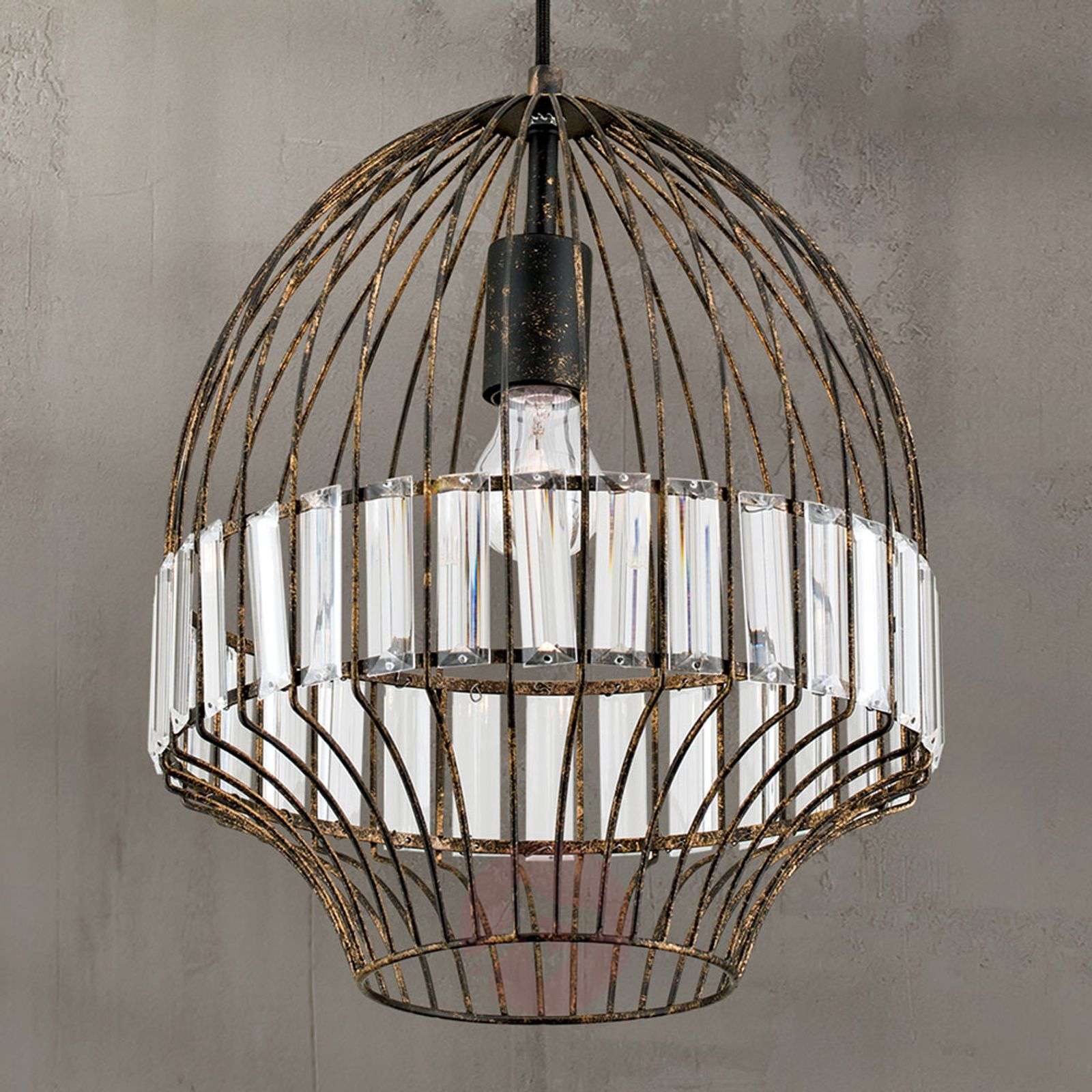 Lampa wisząca Palace zdobiona kryształami z szlifem połówkowym Odcień klatkowego klosza lampy wiszącej Palace przyciąga wzrok nie tylko pięknym kształtem i modną kolorystyką w tonacji antycznej rdzy, ale także biegnącym dookoła wykończeniem z przezroczystymi kryształami ze szlifem połówkowym. Po włączeniu światła, odbicie zapewnia dekoracyjną grę światła. Ze względu na klatkowy klosz, zastosowana żarówka pozostaje widoczna ze wszystkich stron, dlatego zaleca się stosowanie dekoracyjnej lampy rustykalnej lub filamentowej. Pasujące żarówki znajdują się w wyposażeniu dodatkowym. Klasa efektywności energetycznej: A++