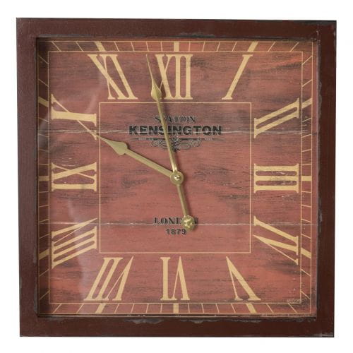Stylowy zegar ścienny ze specjalnie postarzaną ramą.Rama w kolorze brązowym, tarcza znajduje się za szybą.Na tarczy widnieje napis Station Kensington- London 1879.Duże cyfry rzymskie sprawiają, że odczyt czasu jest czytelny.Zegar zasilany na baterie( brak w zestawie).Z pewnością stanie się ozdobą Twojego domu.Ciekawy pomysł na niebanalny prezent.Wymiary: szer. 40cm, gł. 6cm, wys. 40cm.Materiał: płyta mdf/ szkło.Kolor: brązowy.