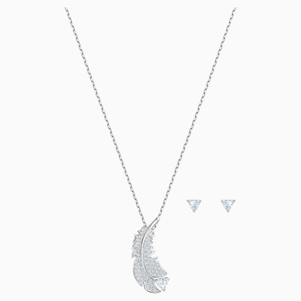 Pióra to w tym sezonie motyw, który po prostu trzeba mieć! Ten elegancki, powlekany rodem zestaw to wyrafinowana interpretacja tego trendu. Zestaw składa się z eleganckiego naszyjnika i subtelnych trójkątnych kolczyków sztyftowych — kunsztownie wykonanych i ozdobionych lśniącą kryształową oprawą pavé. Doskonały dodatek na co dzień. Stanowi również idealny pomysł na świąteczny prezent.