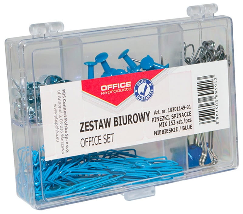 Zestaw biurowy (pinezki, klipy i spinacze) OFFICE PRODUCTS, mix 153szt., niebieski