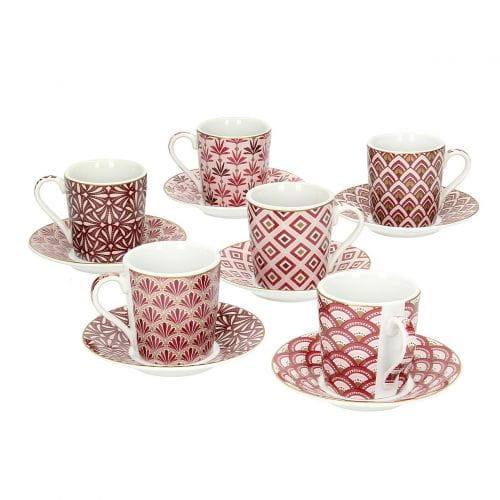 Stylowy zestaw filiżanek do espresso z kolekcji Coffee Mania, którą charakteryzuje modne wzornictwo. Eleganckie filiżanki wykonane z porcelany przyciągają uwagę oryginalnymi nadrukami tworzącymi spójną, estetyczną kompozycję. Klasyczne w formie i wygodne w użytkowaniu zapewnią przyjemne chwile podczas picia kawy. Komplet zapakowany w eleganckie pudełko będzie również stanowił doskonały prezent dla każdego miłośnika kawy. Można myć w zmywarce oraz używać w kuchence mikrofalowej. Wymiary opakowania: szer. 30cm, dł. 25cm, wys. 6,5cm. Wymiary filiżanki: śr. 6cm, wys. 8cm. Materiał: porcelana. Kolor: odcienie czerwieni.Pojemność: 100ml. Waga: 1,24kg.