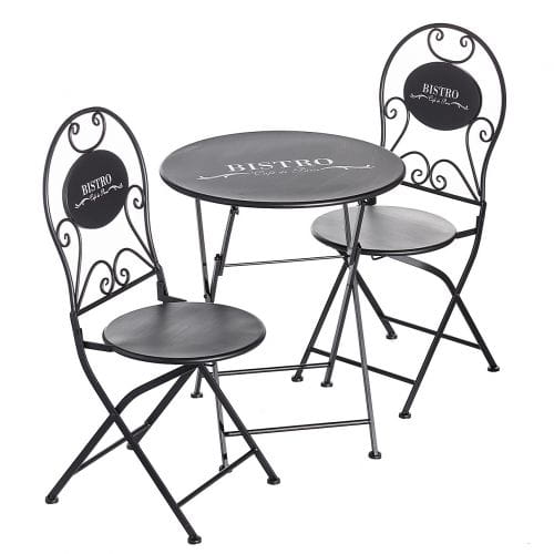 Zestaw mebli ogrodowych wykonany z metalu.Meble w czarnym kolorze z białymi napisami na blacie i oparciu krzeseł. Zestaw zawiera stólik oraz dwa krzesła z dekoracyjnym oparciem.Doskonale wpasuje się w krajobraz ogrodowy, jak również sprawdzi się w warunkach miejskich na balkonach i tarasach. Wymiary: stolik - śr. 62cm, wys. 71cm; krzesło - szer. 40cm, gł. 45cm, wys. 94cm.Waga stolika: 4kg.Waga krzesła: 4,7kg.Materiał: metal.Kolor: czarny.