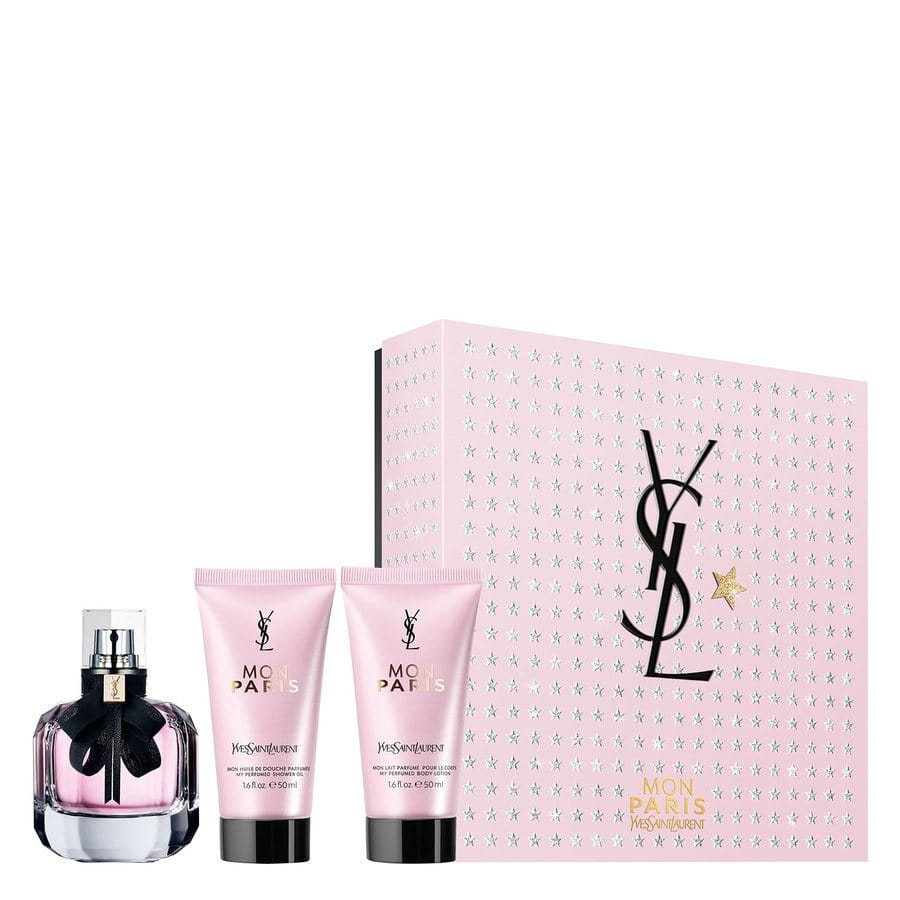 Mon Paris Eau de Parfum występuje w eleganckim zestawie z olejkiem pod prysznic i balsamem do ciała.