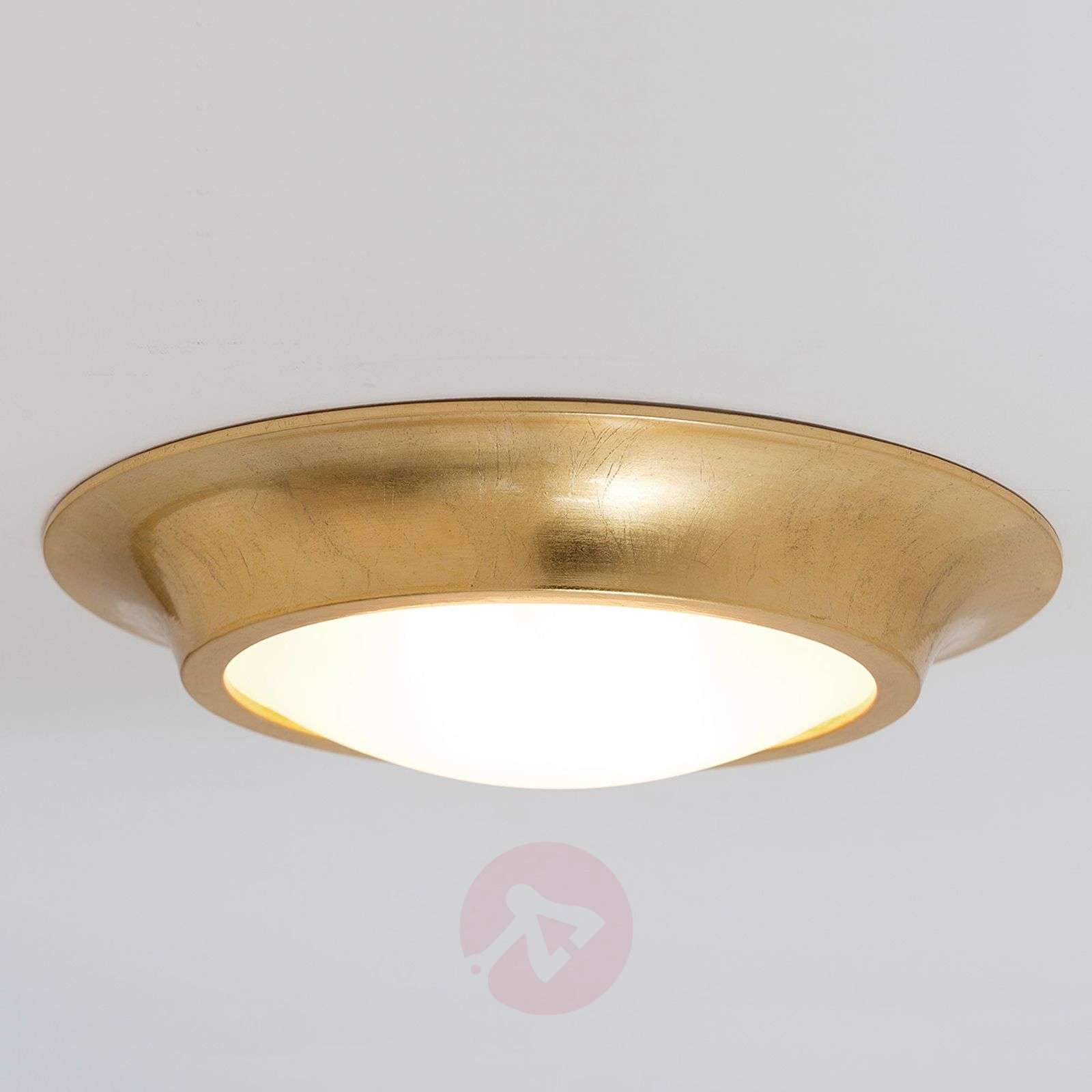 Spettacolo – okrągła, ceramiczna lampa sufitowa wykończona złotem płatkowym Obramowanie lampy sufitowej Spettacolo jest wykonane z ceramiki i pokryte piękną warstwą złota płatkowego, co nadaje lampie szlachetny charakter. Dyfuzor z satynowanego szkła ma lekko wypukły kształt i odpowiada za równomierny, nieoślepiający rozsył światła. Lampę sufitową Spettacolo o średnicy 50 cm można stosować jako główne źródło świata w wielu pomieszczeniach. Klasa efektywności energetycznej: A++