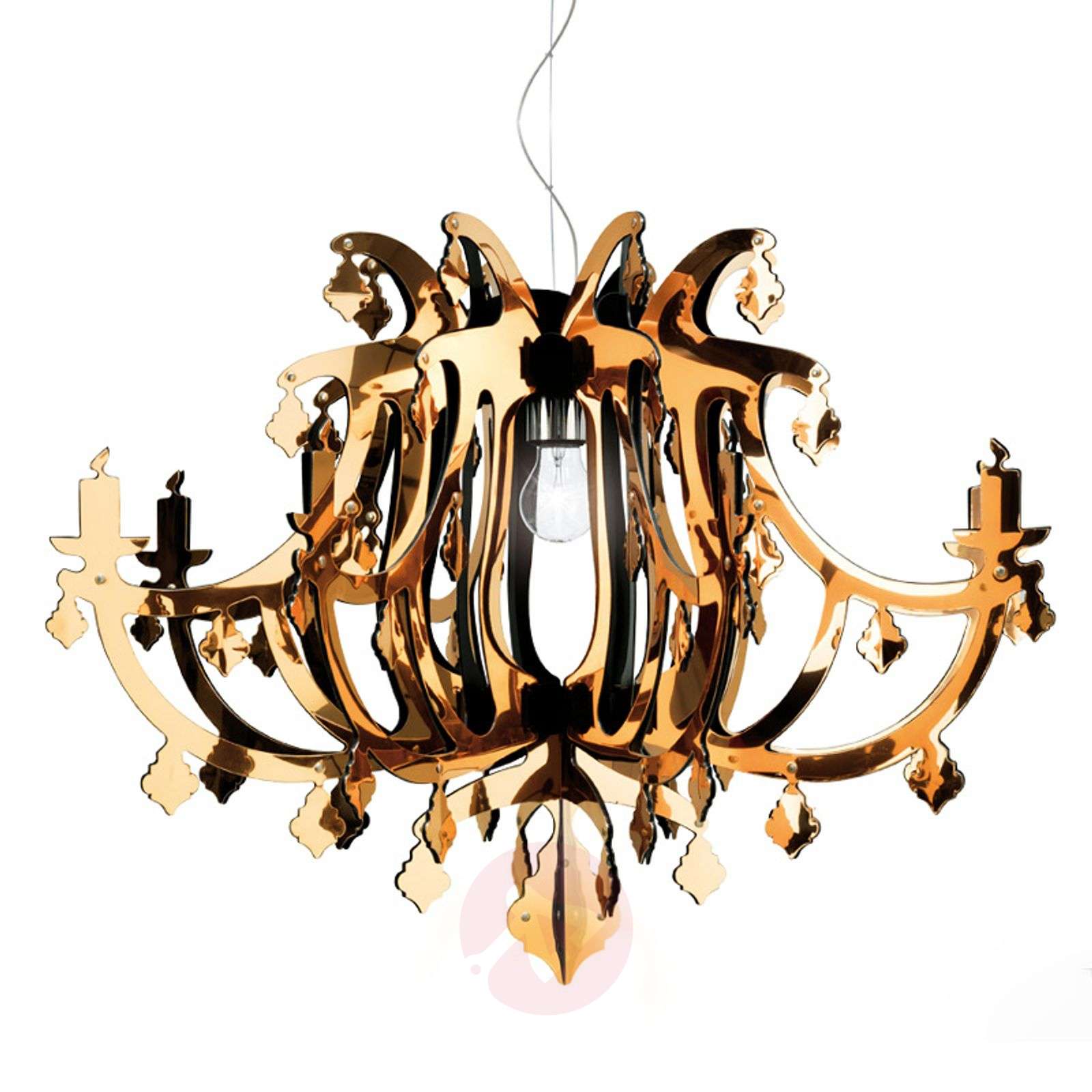 Wystawna designerska lampa wisząca GINETTA, złota GINETTA to nowoczesna lampa w kształcie żyrandola. Wystawną oprawę wiszącą tworzą ramiona otaczające umieszczoną w środku żarówkę. Całość zdobią piękne, umieszczone na końcu każdego z ramion detale stylizowane na świeczki, tak jak w tradycyjnych żyrandolach. Można nawet dostrzec płomyki świeczek. Lampa została wykonana z materiału Steelflex®, który nadaje jej wyjątkowy charakter. Wizjonerskie lampy tworzone przez designerów we Włoszech - Slamp Włoska kuźnia designerów Slamp z siedzibą w Rzymie została założona na początku lat 90. XX wieku. przez Roberto Zilianiego. Ziliani już wcześniej działał twórczo zanim odkrył swoją pasję i możliwości, jaki daje światło. Spełniające najwyższe standardy materiały, wykonanie i jakość Marka Slamp kładzie szczególny nacisk na tworzenie nowych materiałów. Oprócz naturalnych i tradycyjnych surowców takich jak skóra, miedź, kryształ czy stal szlachetna firma Slamp wykorzystuje również własne opatentowane materiały jak Cristalflex®, Opalflex® i Lentiflex®. Dzięki nim możliwe jest stworzenie wyjątkowych efektów świetlnych. Na przykład materiał Lentiflex® służy jako woda, która w zależności od kąta patrzenia zmienia kolor. To właśnie własne materiały marki Slamp oraz powstałe z nich lampy są silnymi atutami firmy. Należą do nich również między innymi spory poziom innowacji, kreatywności oraz oryginalności, a także doskonałe wyczucie działania światła. Klasa efektywności energetycznej: A++