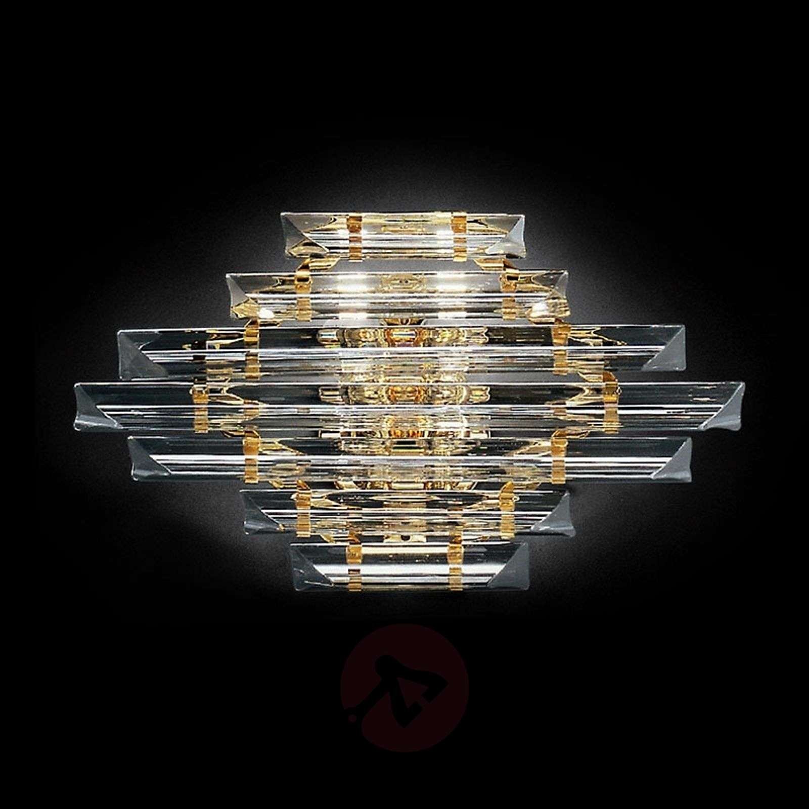Kryształowa lampa ścienna Losanghe ze 24-karatowym złoceniem metalowej ramy Kryształowa lampa ścienna Losanghe zalicza się do tych o wyjątkowo klasycznej nucie. Odpowiedzialna za to jest nie tylko pozłacana metalowa rama, którą może dojrzeć przez kryształowe płytki. Zapewnią iskrzące światło korytarzu, pokoju dziennym lub sypialni. Klasa efektywności energetycznej: A++