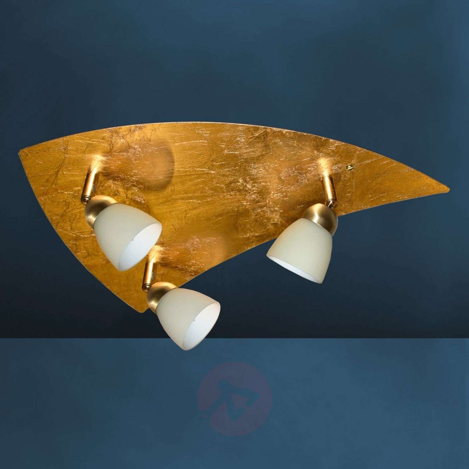 Złota lampa sufitowa ELEGANCE o dynamicznym kształcie Lampa sufitowa z serii ELEGANCE to szlachetna ozdoba, która będzie świetnie pasowała do różnych stylów wyposażenia wnętrz. Powierzchnia trójkątnej osłony jest udekorowana płatem prawdziwego złota. Wygięty kształt nadaje tej lampie dodatkowej dynamiki. Trzy wykonane z satynowanego szkła reflektory są wychylne i zapewniają przyjemne oświetlenie, które wytwarza na złoconej powierzchni interesujące refleksy świetlne. Klasa efektywności energetycznej: A++