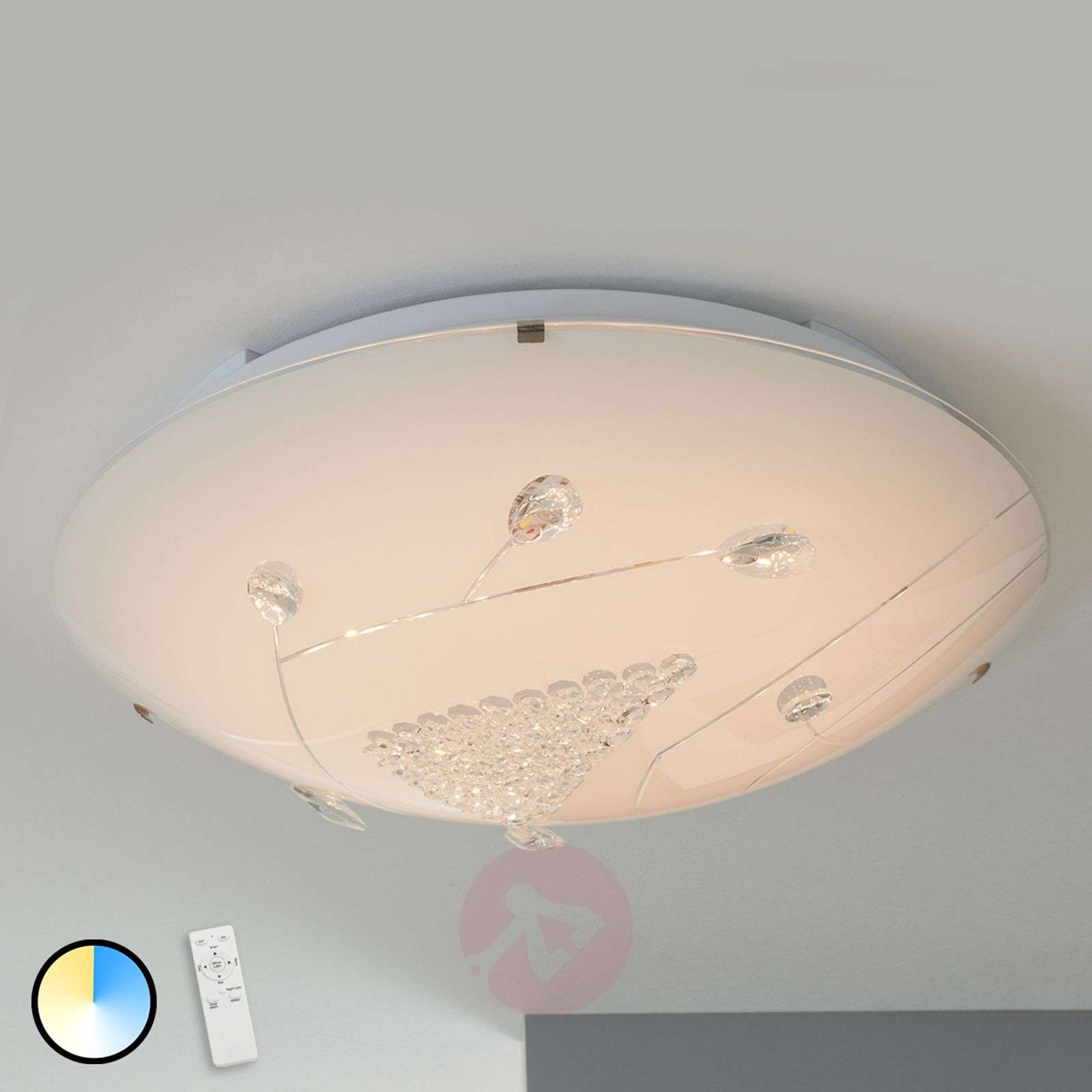 Lampa sufitowa LED Agiled o zmiennej barwie światła Okrągła lampa sufitowa Agiled charakteryzuje się miękkim, kwiatowym wzorem, który dyskretnie zdobi sufit w świetle dziennym. Wdzięczne prowadzenie linii nie powinny jednak nikogo zwieść: Lampa sufitowa oświetla całą mocą światła, a dzięki satynowemu szklanemu kloszowi – rozproszonym światłem całe pomieszczenie. Bezstopniowa regulacja barwy światła może być wygodnie obsługiwana za pomocą pilota. Agiled jest również wyposażony w ściemniacz bezstopniowy, dzięki czemu światło można łatwo dopasować do każdej sytuacji. Kolejna szczególna cecha lampy sufitowej LED Agiled: posiada ona funkcję timera, która umożliwia zaprogramowanie wyłączania na 30 minut. Na przykład, w pokoju dziecięcym podczas zasypiania można włączyć delikatne oświetlenie pomieszczenia. Aby nie wyłączać całkowicie lampy sufitowej na noc, a mimo to oszczędzać energię elektryczną, można również aktywować praktyczną funkcję oświetlenia nocnego. Klasa efektywności energetycznej: A+
