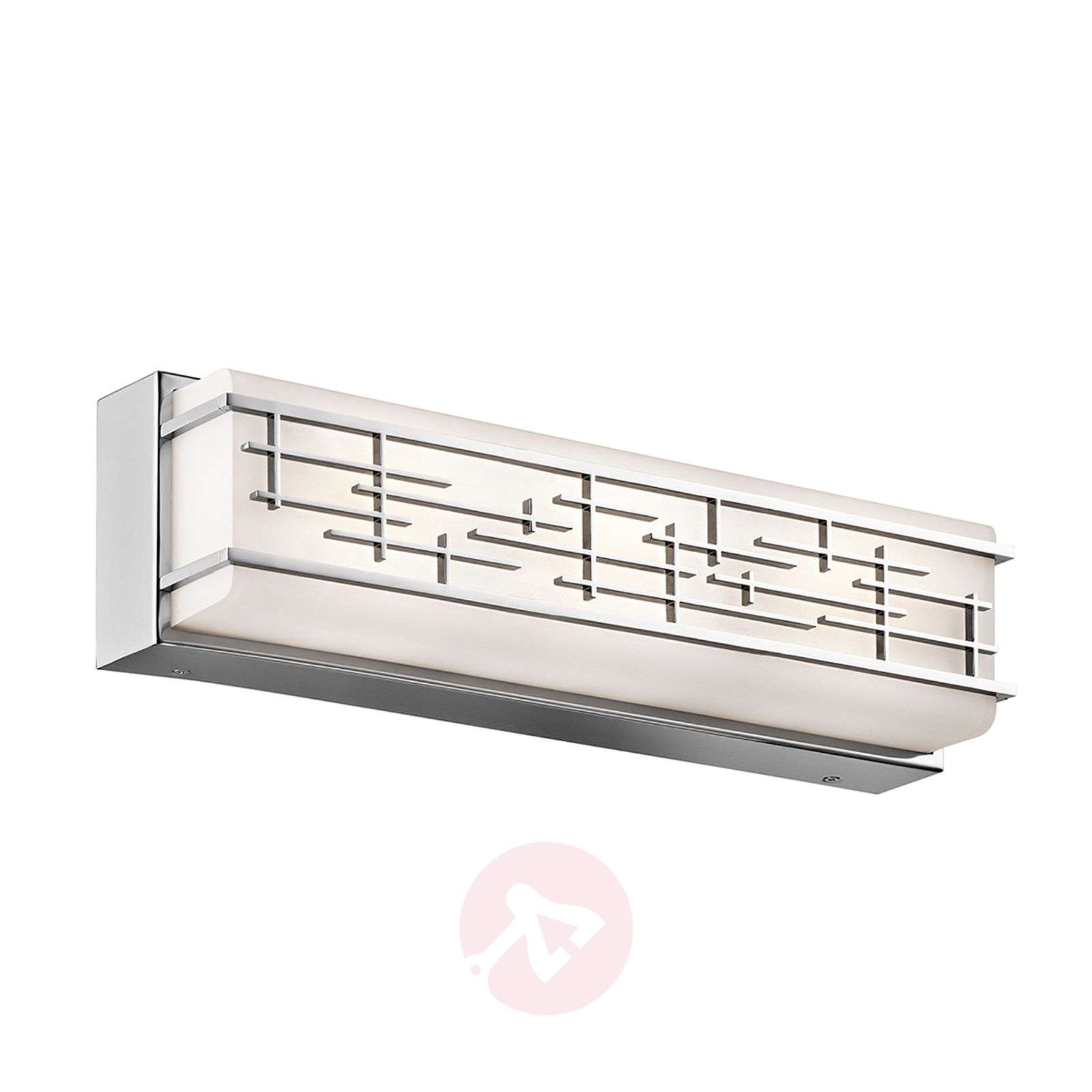 Uniwersalne zastosowanie – kinkiet LED Zolon z graficznym wzorem Dzięki kinkietowi LED Zolon pewne obszary w łazience lub w całym salonie mogą być oświetlone w sposób niezwykle energooszczędny. Dzięki nowoczesnemu i równie ponadczasowemu designowi lampę można wspaniale połączyć z istniejącymi meblami, tak że nie będzie się ona zbytnio rzucać w oczy. Ciepłobiałe światło LED dzięki doskonałej jakości szybie ze szkła opalowego jest delikatne, nie oślepia i równomiernie przedostaje się do otoczenia. Chromowane, opatrzone grafiką elementy metalowe umieszczone nad kloszem, zapewniają lampie szczególnie dekoracyjny wygląd. Klasa efektywności energetycznej: A+