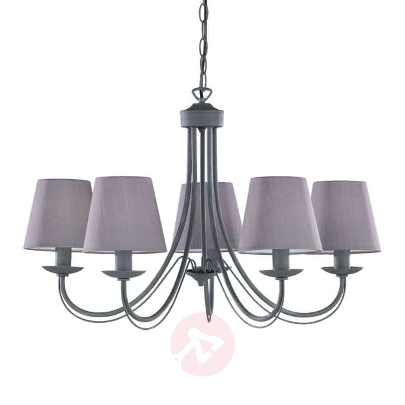 Cortez – elegancki żyrandol w kolorze szarym Trudno oderwać wzrok od tego ponadczasowego żyrandola Cortez. Pięć szarych kloszy z tkaniny i metalowe zawieszenie w kolorze betonu tworzą harmonijny i nowoczesny obraz. Subtelne prześwitywanie tekstylnych kloszy zapewnia przyjemne oświetlenie pomieszczenia bez efektu oślepiania. Odpowiednie żarówki znajdują się w „Akcesoriach dodatkowych” żyrandola. Klasa efektywności energetycznej: A++